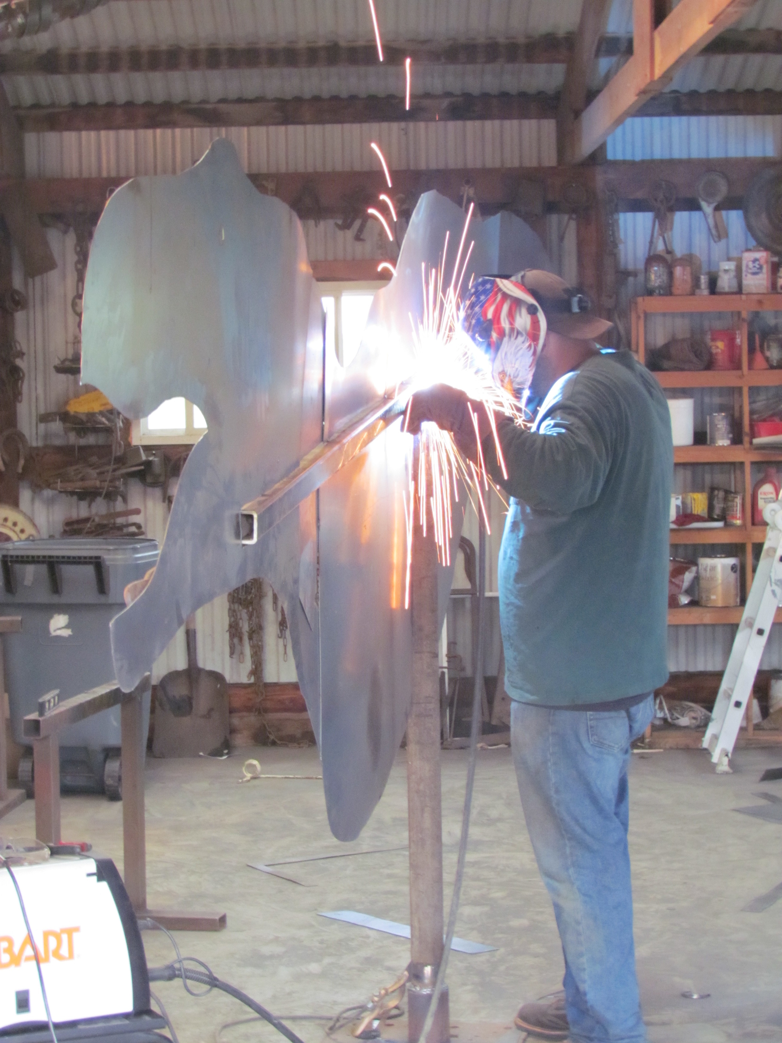 Sparks fly in the shop during the construction of a 13 foot long T-Rex.